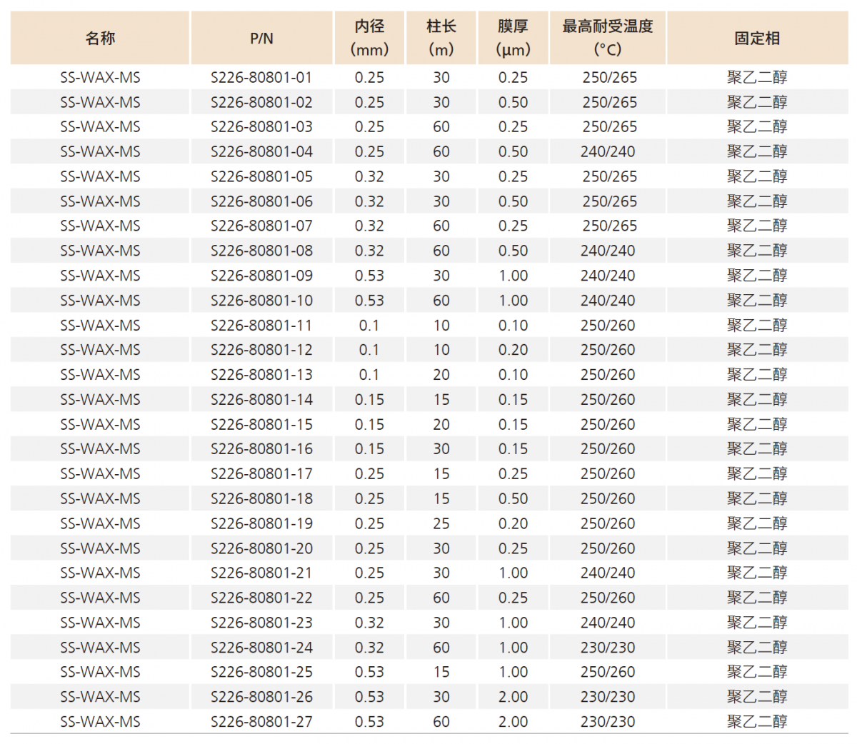 SS-WAX-MS 是一種為GCMS 應(yīng)用而開(kāi)發(fā)的高性能、低流失WAX 柱。通過(guò)提高鍵合交聯(lián)強(qiáng)度,可拓寬耐受溫度范圍 (20-250/260 ℃ )。此外,優(yōu)異的去活工藝確保對(duì)稱峰形和靈敏響應(yīng),并能長(zhǎng)期保證高惰性,確保使用的穩(wěn)定性。這些都有助于提高低沸點(diǎn) 化合物的分離效能以及分析結(jié)果的重現(xiàn)性和穩(wěn)定性。