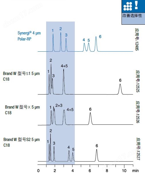 流動相中加入甲醇以進一步的提高選擇性。甲醇可以促進分析物中的芳環與Synergi Polar-RP苯基