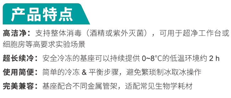 恒溫金屬冰盒,由底部基座和上部金屬管架兩部分組成,完全冷凍的基座可持續(xù)提供0~8℃低溫環(huán)境約2小時,確保加樣過程中樣品和試劑的活性,有效提高實驗可靠性和工作效率?;闹黧w為鋁材,內(nèi)部填充環(huán)保水基變相材料,外層硅膠套具有保護基座與保溫雙重效果?;鶐в袦囟扔?,具有溫度指示功能,當溫度計指針指示在0℃左右時,表明基座進入溫度穩(wěn)定期。此外,恒溫金屬冰盒配套有毛巾,方便吸附冷凝水。