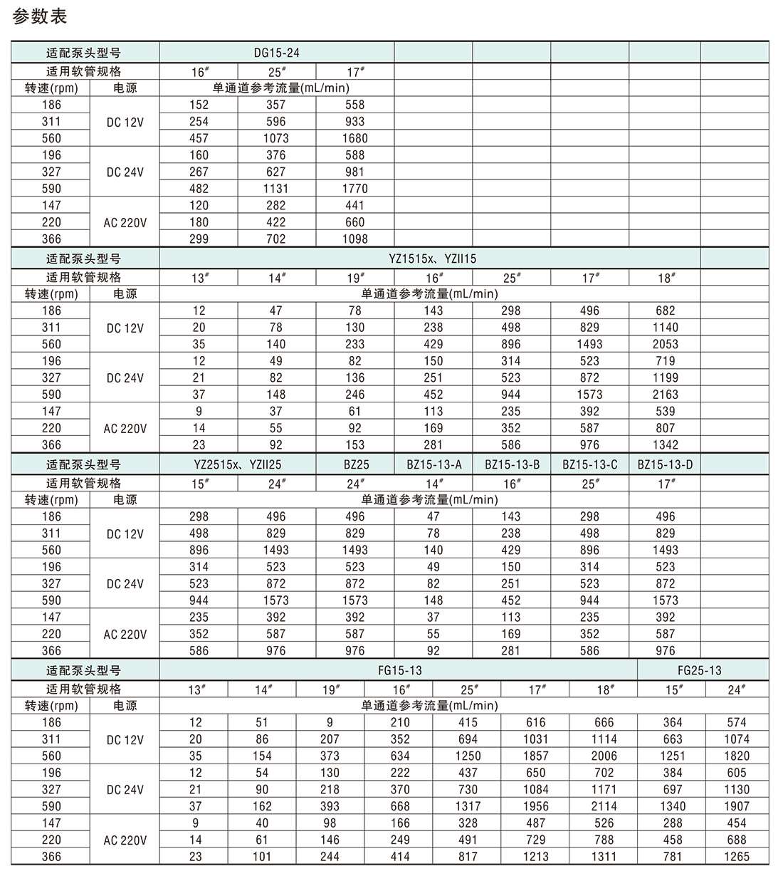適配泵頭:YZ1515X,YZ2515X,YZⅡ15,YZⅡ25等。其他泵頭型號以及適用軟管規格,請參考最新產品樣本。