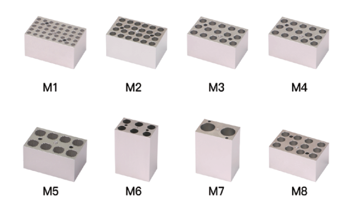 型號 / 孔徑 / 試管數 / 備注M1 / 0.2ml 離心管 / 40×0.2ml / 可適用8×0.2ml 排管M2 / 0.5ml 離心管 / 24×0.5mlM3 / 1.5ml 離心管 / 15×1.5mlM4 / 2.0ml 離心管 / 15×2.0mlM5 / 比色皿專用 / 8×12.5×12.5mlM6 / 15ml 離心管 / 6×15ml / 保溫蓋無法合上M7 / 50ml 離心管 / 2×50ml / 保溫蓋無法合上M8 / 5.0ml 離心管 / 12×5.0ml