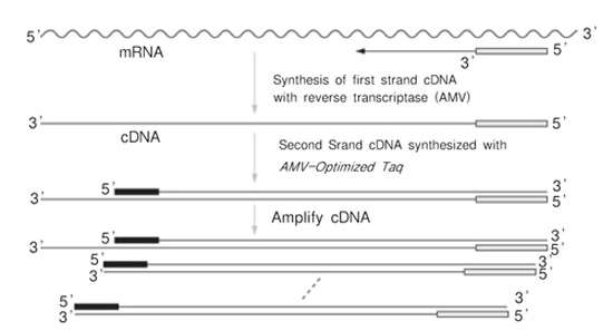 | TaKaRa One Step RNA PCR Kit (AMV) 可在同一反應管中完成由AMV 反轉錄酶從RNA反轉錄為cDNA,再使用AMV-Optimized Taq擴增此cDNA的RT-PCR反應。 |